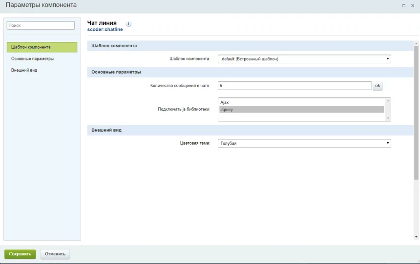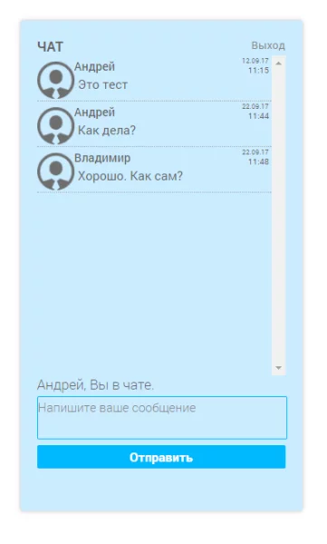 Чат реализован с помощью ajax технологии, линия обновляется периодически через интервал времени. Для корректной работы необходимо подключение библиотек jquery и ajax, тоже задается в настройках компонента.