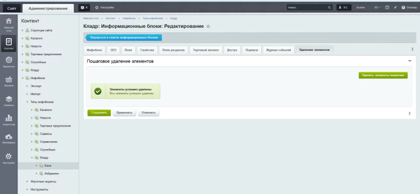 - Инструменты, коллекции, групповые действия / Перекрестные продажи / Аналогичные товары / Аксессуары - данный модуль в набор своих обширных возможностей также включает пошаговое удаление элементов с еще более расширенным функционалом фильтрации по полям и свойствам.