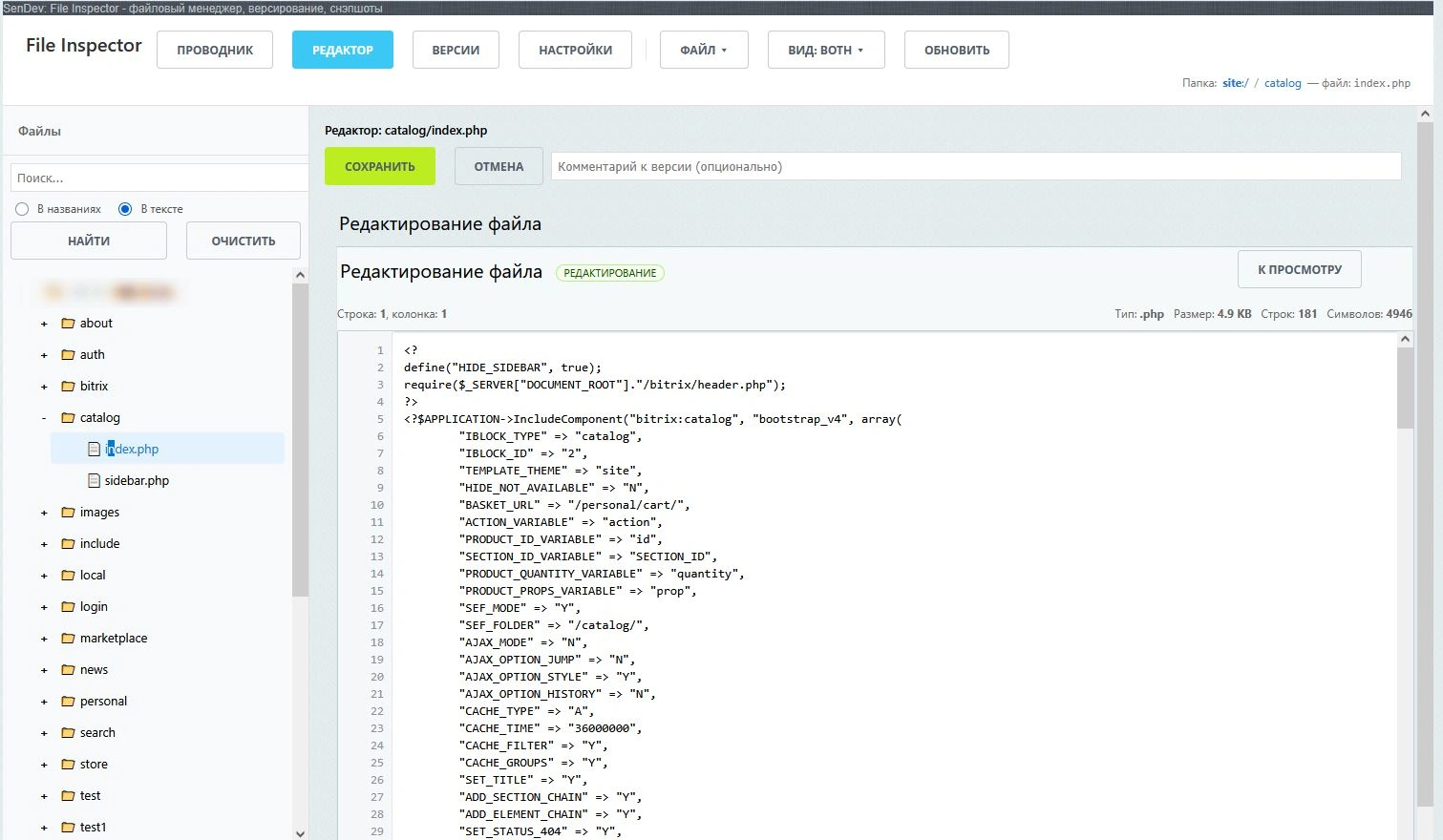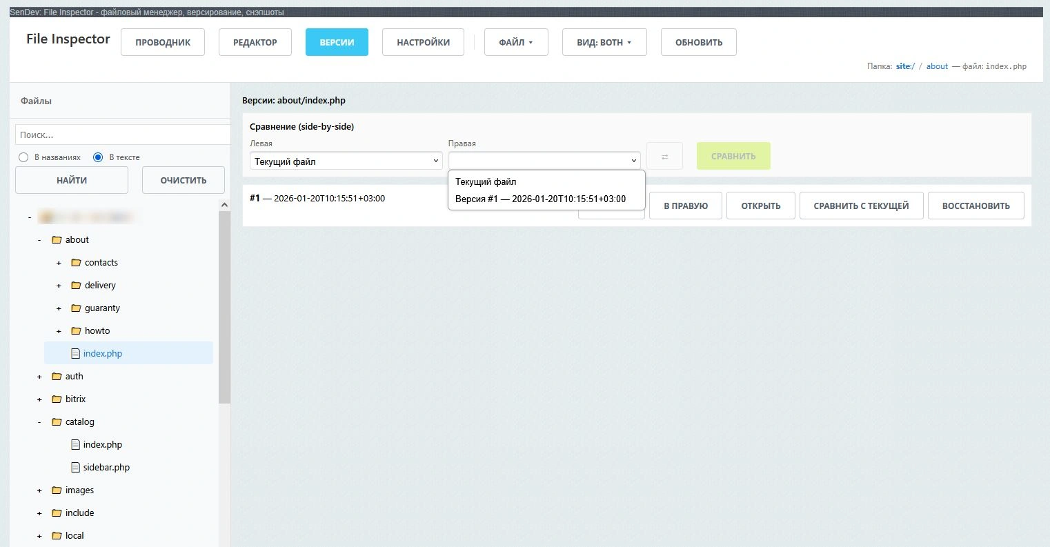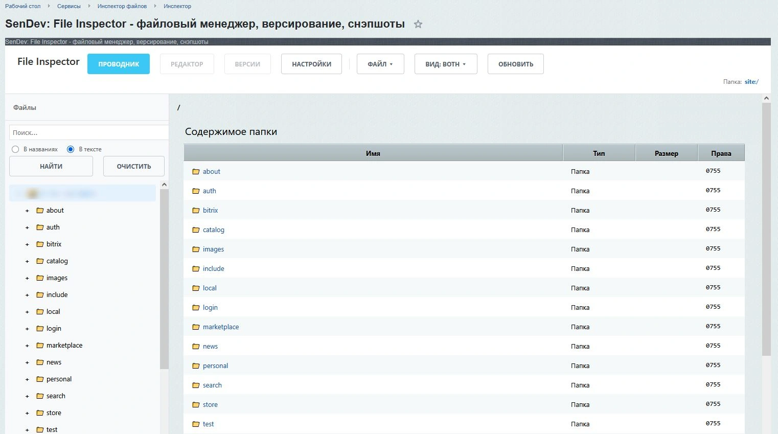 SenDev: File Inspector — профессиональный инструмент для технического аудита и управления файловой системой проекта на 1С-Битрикс. В отличие от стандартных решений, он предлагает не просто просмотр файлов, а полноценную систему контроля версий и анализа изменений.