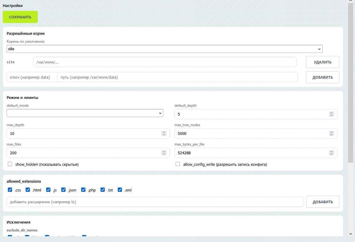 - Полный контроль через настройки: корни, расширения, глубина обхода, лимиты памяти