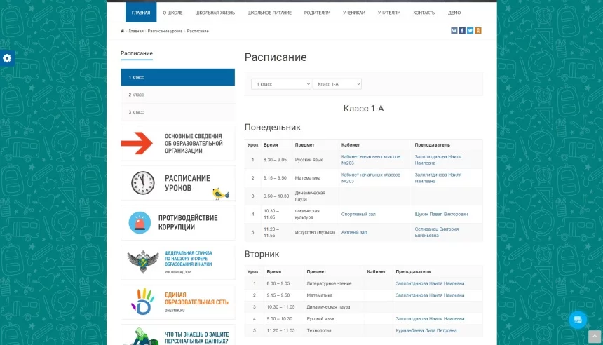 - Динамическое «Расписание уроков» с выбором класса или учителя.