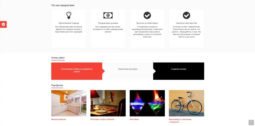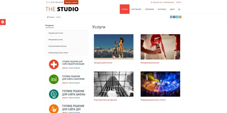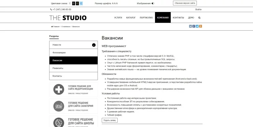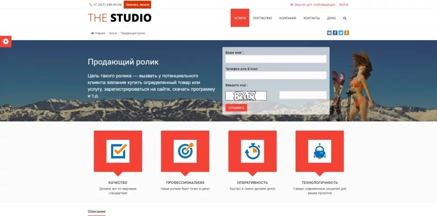 - Большие информационные возможности: каталог продукции, подробное описание услуг компании, новости, вакансии, фотогалерея.