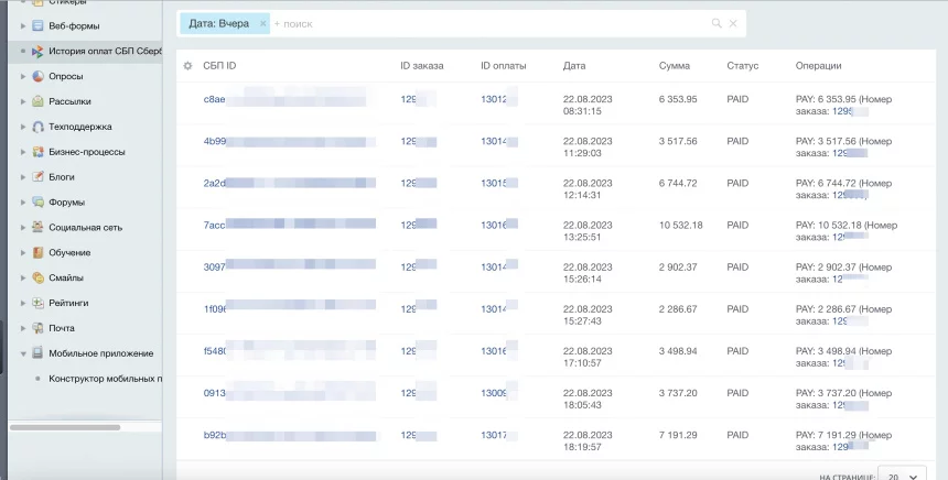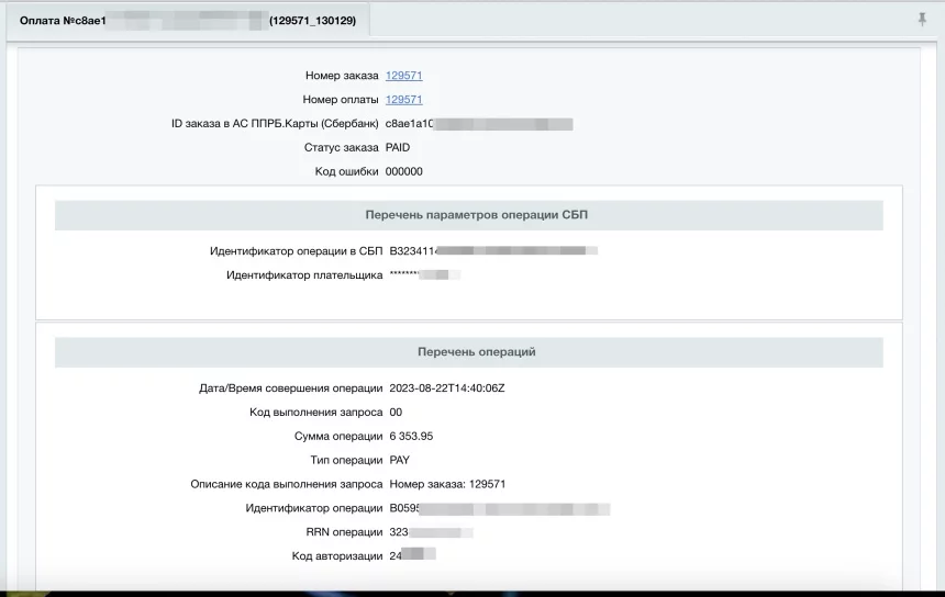- имеет возможность просмотра истории оплат с просмотром детальной информации о каждой оплате (Сервисы - История оплат СБП Сбербанк).