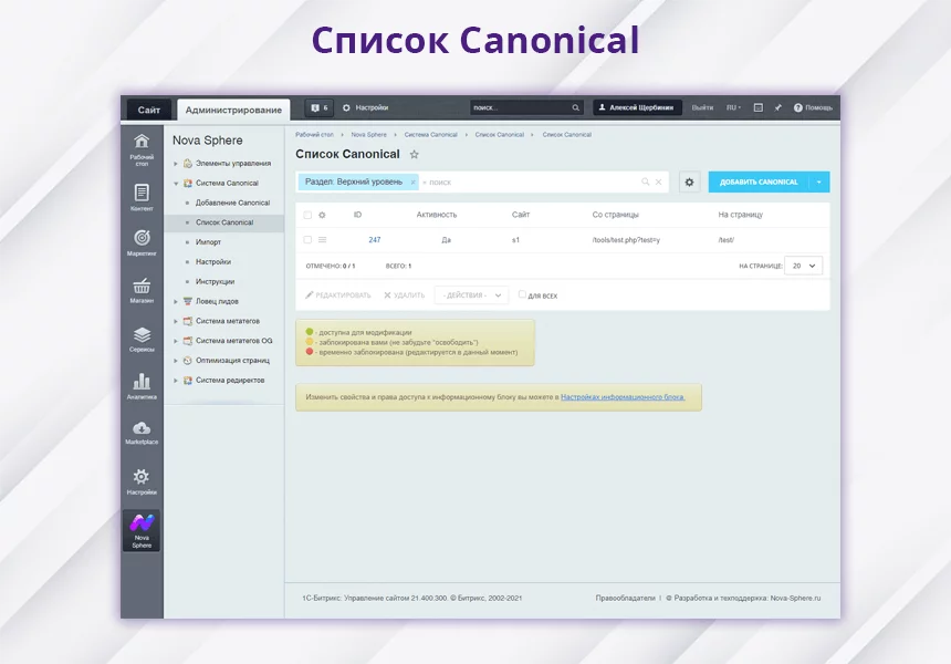 Управление настройками модуля располагается «Nova Sphere – Система Canonical – Настройки».