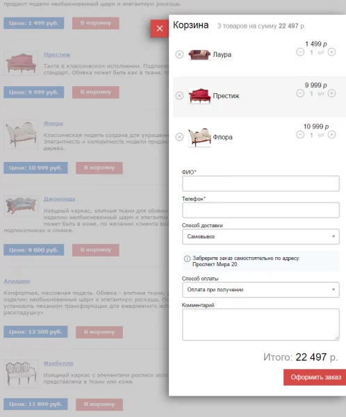 - работает без перезагрузки страницы. При оформлении заказа, пользователя не перенаправляет на другую страницу, клиент остается в каталоге товаров