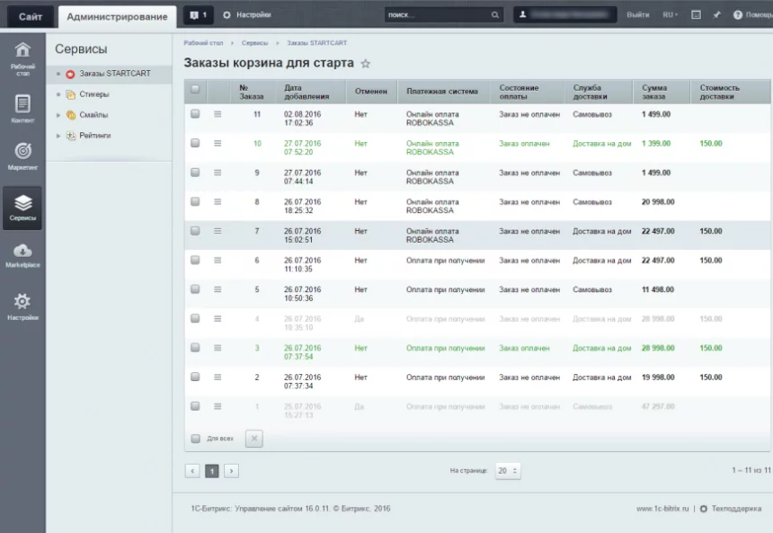 - для удобства работы с заказами создан интерфейс в административном разделе в меню Сервисы-> Заказы STARTCART
