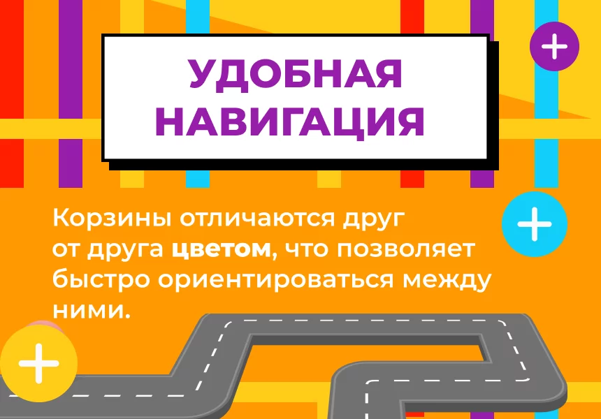 ![]() | Удобная навигация Корзины отличаются друг от друга цветом, что позволяет контрагенту быстро находить нужную среди них. ![]() ![]() ![]() |