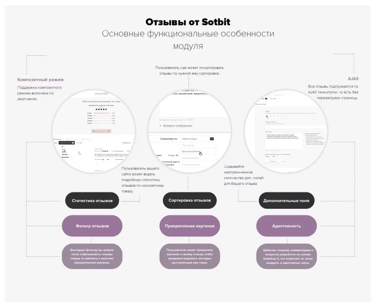 | Увеличение конверсии и продаж. Положительные и качественные отзывы от реальных пользователей влияют на решение о покупке. Модуль помогает демонстрировать такие отзывы, что повышает доверие клиентов и стимулирует конверсии. |