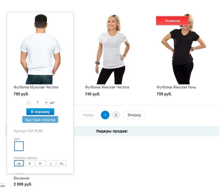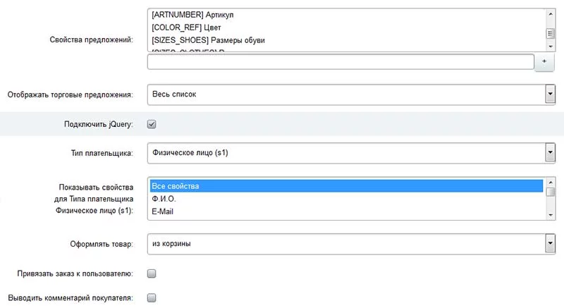 11) поддержка торговых предложений (СКУ) с выбором свойств так и без СКУ;