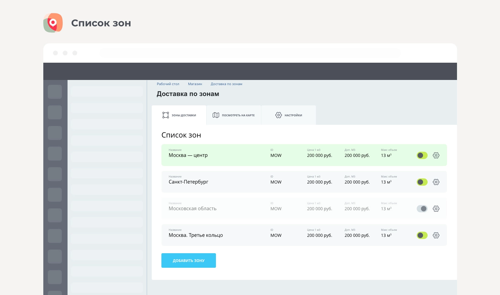 Зоны доставки могут находится в одном городе или в нескольких городах.