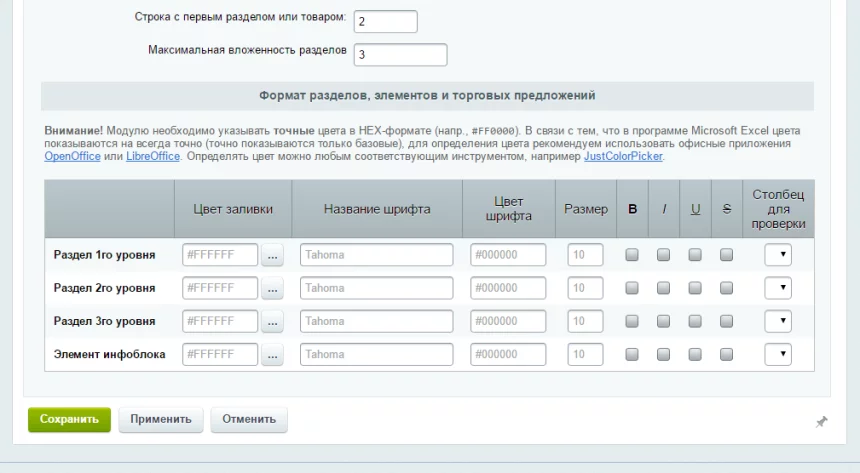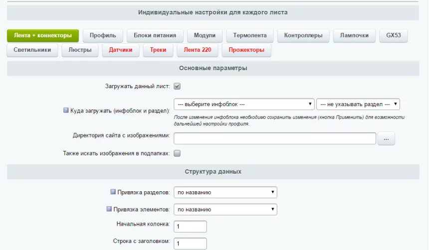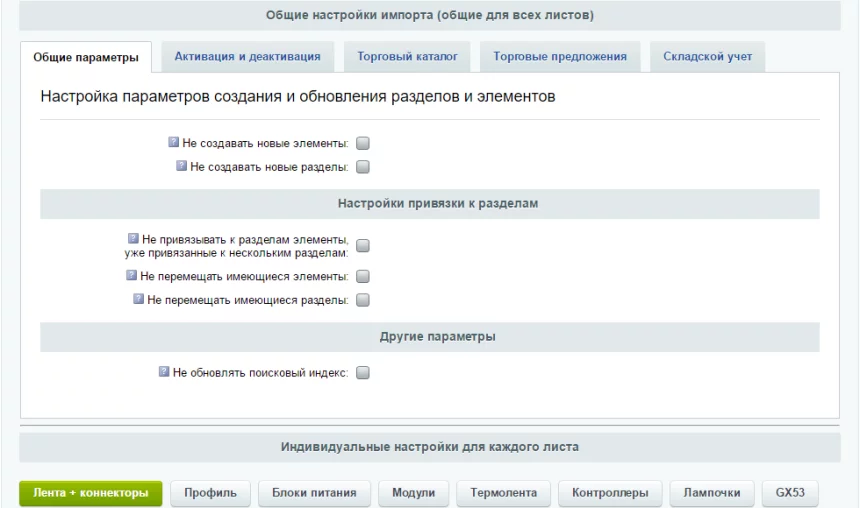 Одна из основных особенностей модуля – огромное количество настроек, что позволяет максимально гибко настроить выгрузку по Ваши требования. Имеется возможность настроить сложные привязки (что может быть актуально для загрузки в уже действующий каталог), подходящую логику активации и деактивации товаров и разделов, включить или отключить загрузку торговых предложений и т.д.
