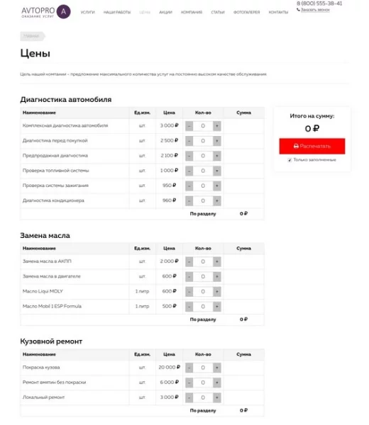 - встроенный калькулятор в цены на сайте позволяет рассчитать стоимость работ, сохранить их и распечатать