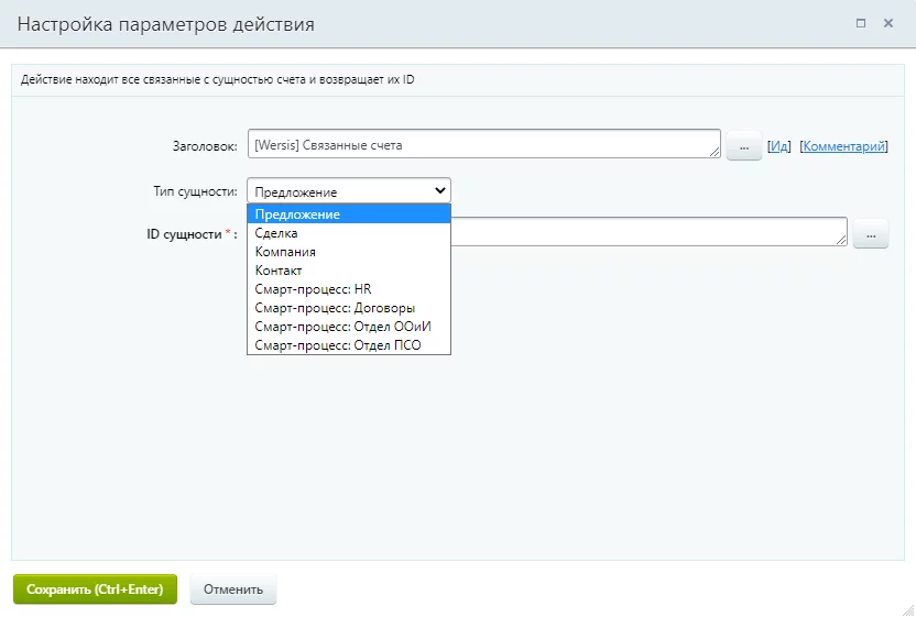 Активити "Связанные счета с сущностью CRM"