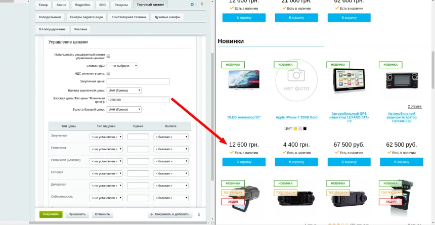 Всі зазначені націнки працюють з усіма типовими компонентами Бітрікс - списками товарів, карткою товару, кошиком, оформленням замовлення і тригерних розсилками
