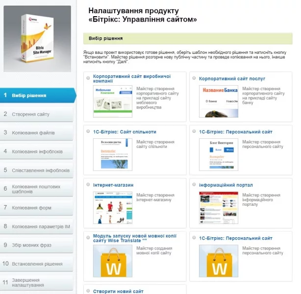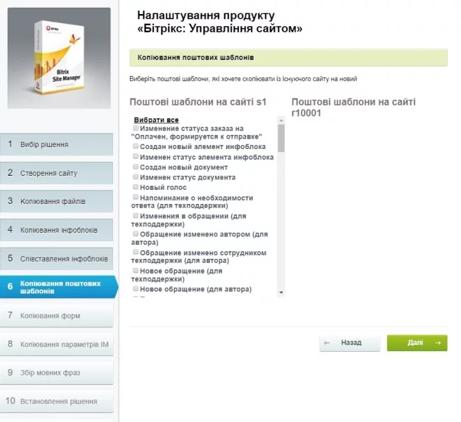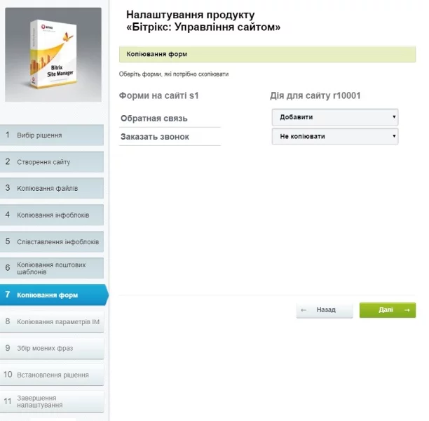 Під час роботи модуля здійснюється копіювання всіх даних сайту: файлів, шаблонів публічної частини, інфоблоків, поштових шаблонів, форм, параметрів інтернет-магазину та ін.